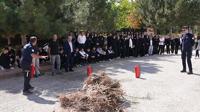 Bu doğrultuda Elazığ İtfaiyesi, Necip Fazıl Kısakürek Anadolu Lisesi’nde de deprem ve yangın tatbikatı gerçekleştirdi. Tatbikatta, itfaiye personelleri yangın güvenliği konusunda öğrencilere detaylı bilgiler verirken yaşanabilecek deprem ve yangın gibi afetlerde panik yapmadan nasıl hareket edilmesi gerektiğini ve çıkan yangına karşı nasıl müdahale edilmesi gerektiğini uygulamalı olarak gösterdi. Ardından, yangının tanımı ve türleri, yangının sebepleri ve risk faktörleri, yangın öncesi alınması gereken önlemler, yangın anında doğru davranış biçimleri ve yangın söndürme teknikleri, depremin tanımı ve oluşumu, deprem öncesi hazırlıklar, deprem anında doğru davranışlar gibi konularda seminer düzenlendi.